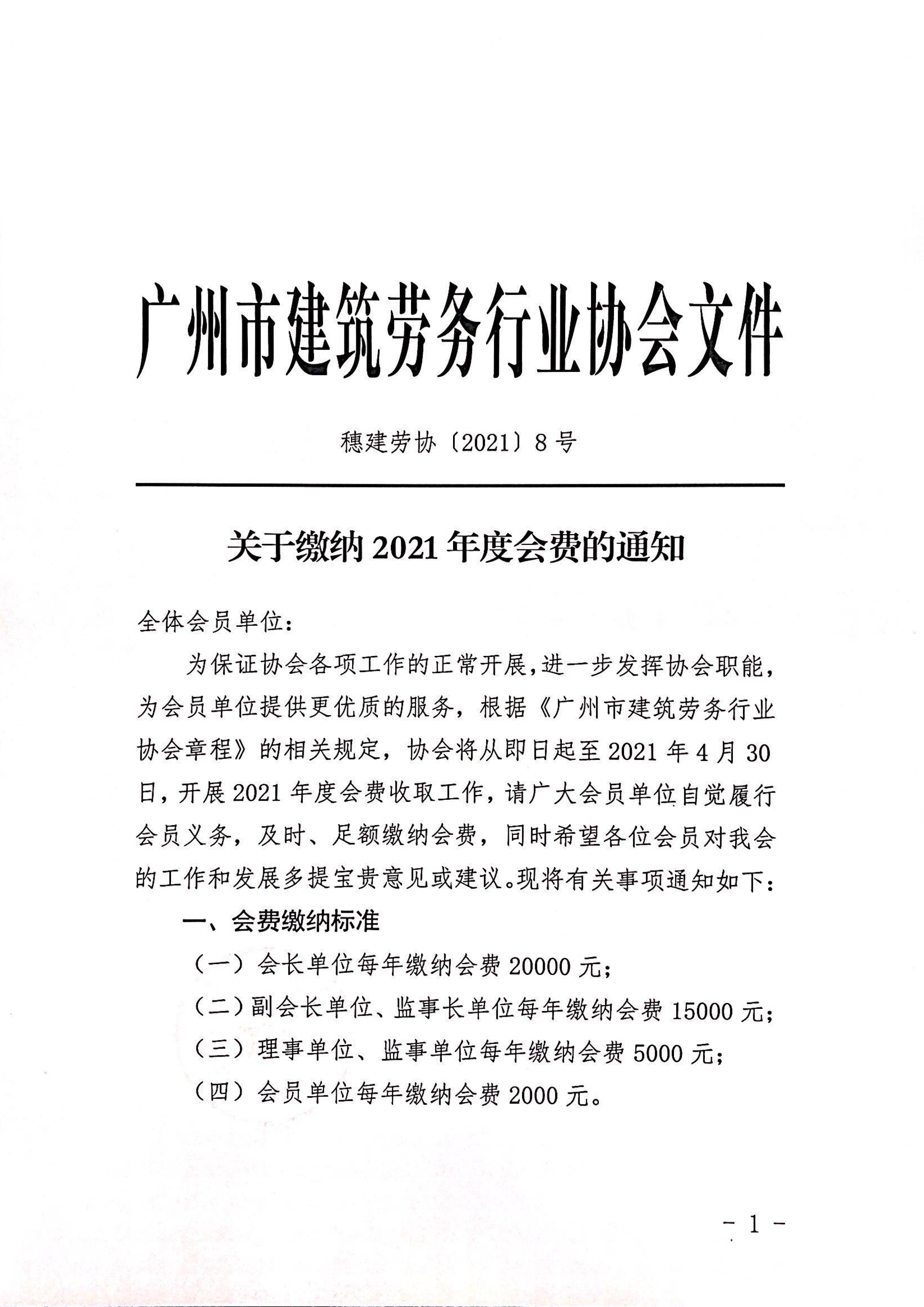 【通知公告】〔2021〕8号文 广州市建筑劳务行业协会关于缴纳2021年度会费的通知